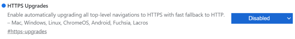 地址栏输入 chrome://flags 回车,在下面找到 HTTPS Upgrades 设为 Disabled,然后重启浏览器即可。