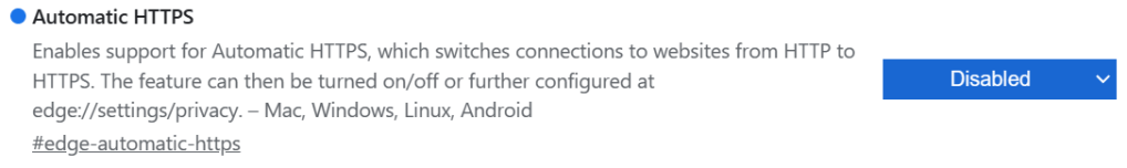 地址栏输入 edge://flags 回车,在下面找到 Automatic HTTPS 设为 Disabled,然后重启浏览器即可。