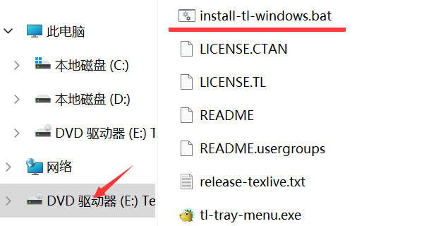 2、下载到的文件是texlive.iso光盘镜像文件,Windows里双击即可载入到虚拟光盘,只是文件有点大,耐心等一下。如下,在文件install-tl-windows.bat上右键“以管理员身份运行”,就开始安装了。