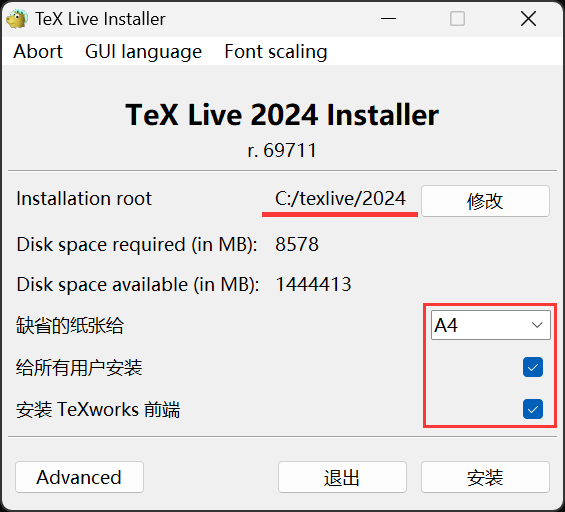 3、各安装选项保持默认,安装到“C:/texlive/2024”目录下