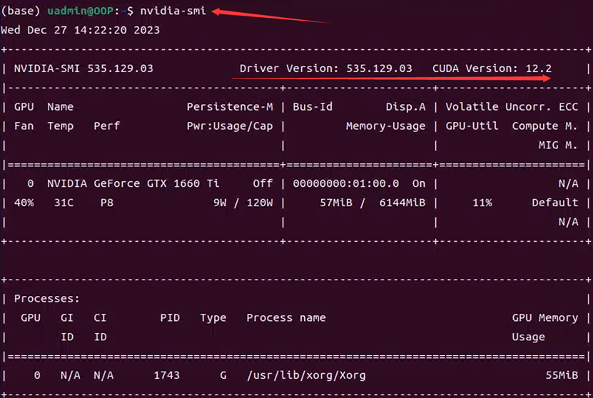 如下输出表示驱动安装正确,可以看到对应CUDA版本为12.2