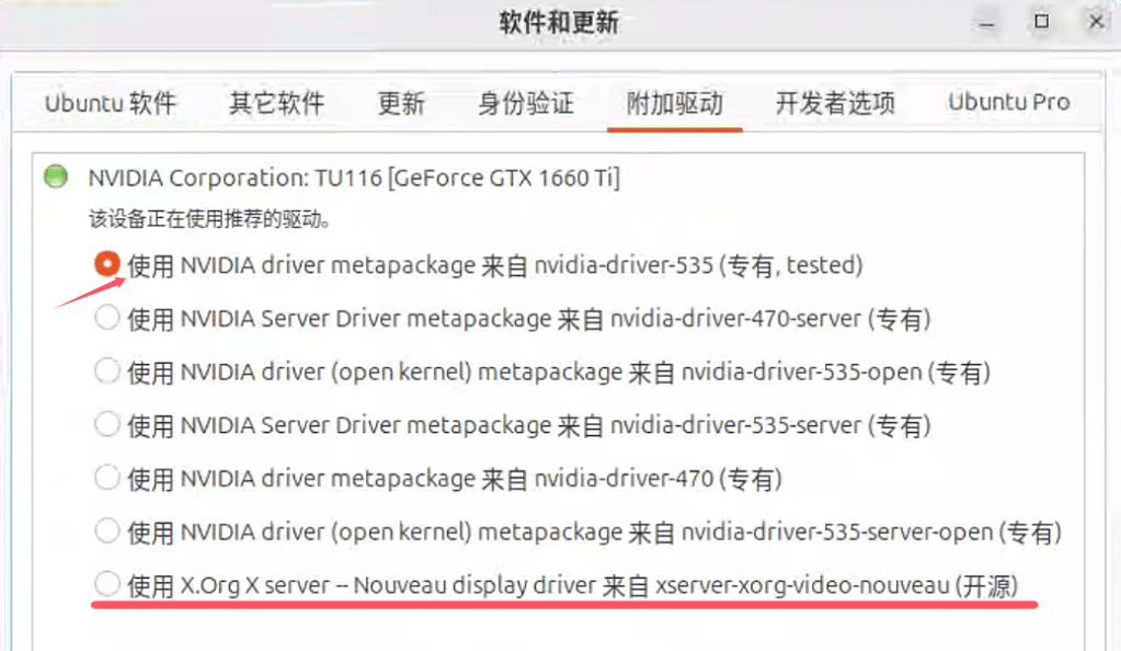 打开“软件和更新”-“附加驱动”里显示的是最后一项,开源驱动。直接选中第一项专有驱动,然后应用。就开始自动卸载开源驱动,下载安装专有驱动。