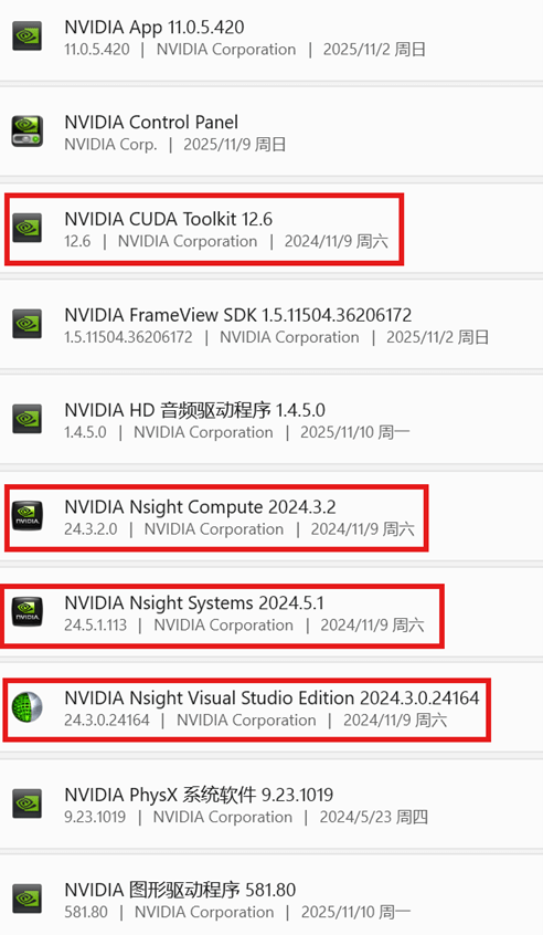 (2)然后卸载CUDA,如下图所示4项,从安装时间上就可以看出这4项是一起安装的,并且和cuDNN是同一天安装的:
